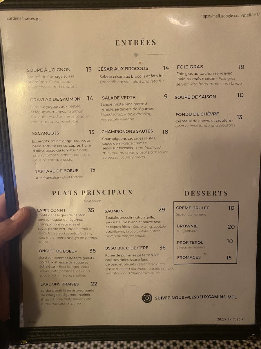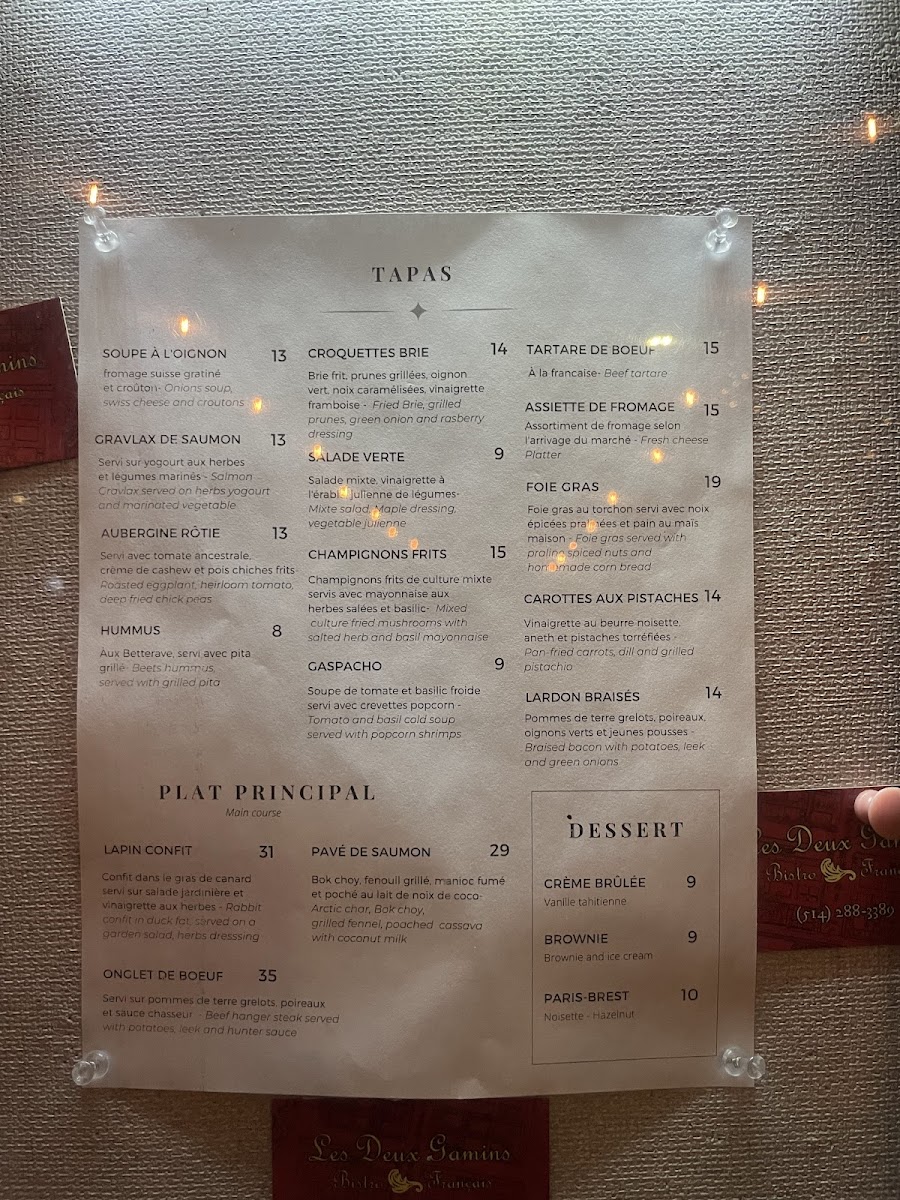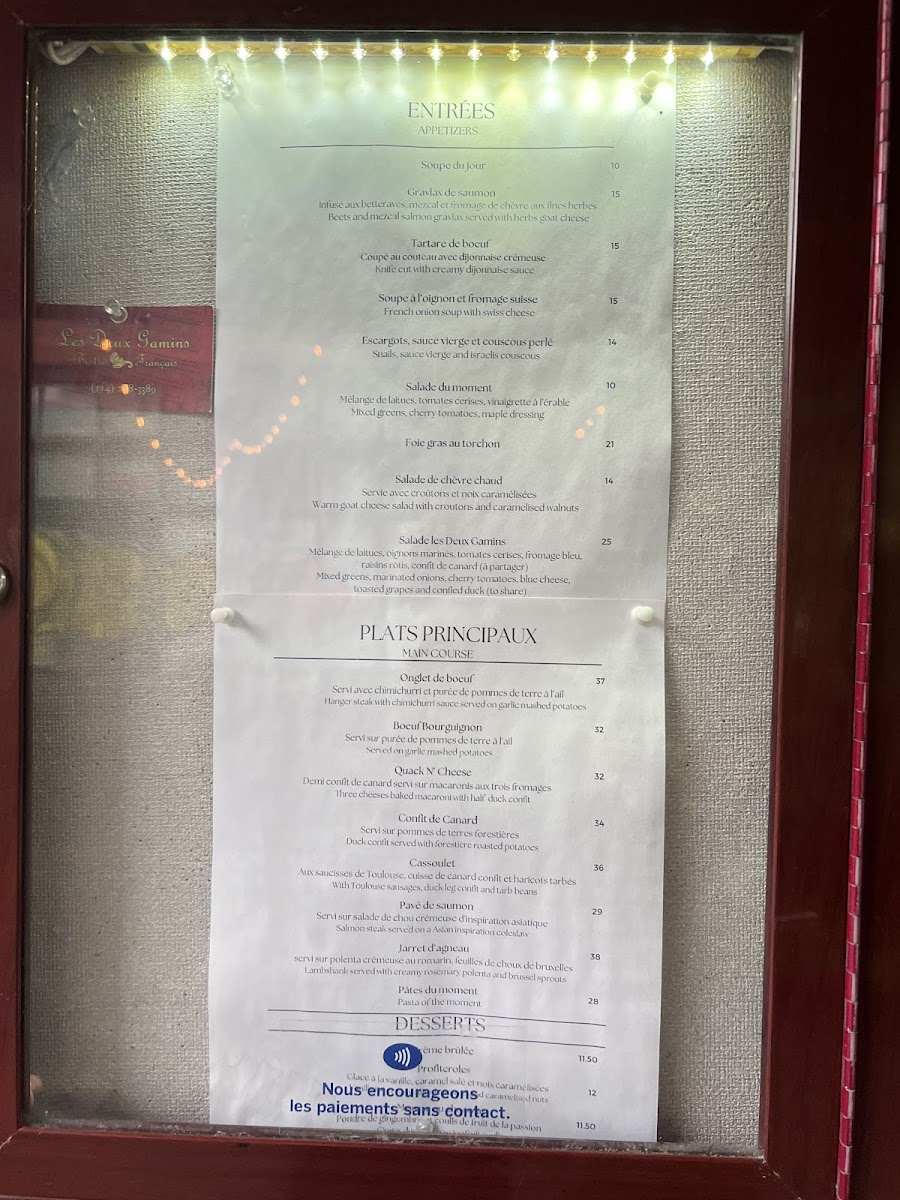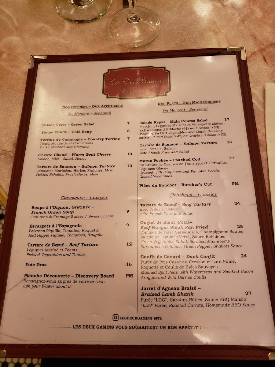 Indulge in the rich flavors of French cuisine at Les Deux Gamins restaurant, located at 170 Rue Prince-Arthur E in Montréal, QC. Our menu features a variety of classic dishes that will transport your taste buds to the heart of Paris. Start off with our famous French Onion Soup or try the Escargot for a truly authentic experience. For mains, don't miss out on the tender Lamb Shank or the flavorful Beef Tartare. And make sure to save room for dessert with our exquisite Profiteroles or the decadent Paris Brest. With highlights like Gravelax, Ravioli, and Cassoulet also on offer, there's something for every palate at Les Deux Gamins. Come and taste the delicious specialties that make our restaurant a culinary gem in Montreal.